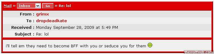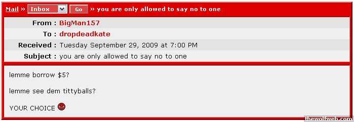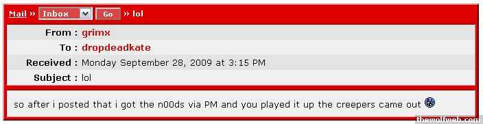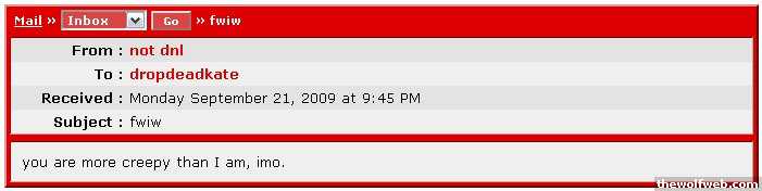 From : GoldenGirlTo : drunknloadedReceived : Thursday November 13, 2008 at 5:53 AMSubject : .You are an idiot.From : GoldenGirlTo : drunknloadedReceived : Thursday November 13, 2008 at 6:02 AMSubject : Re: .wow you posted my pm in a thread. kudos to you. I know where I stand in life and you and 99% of tww are the last people on earth that I need to prove anything to.ok that note hope you get over your issues and feel better sooner than later. ]