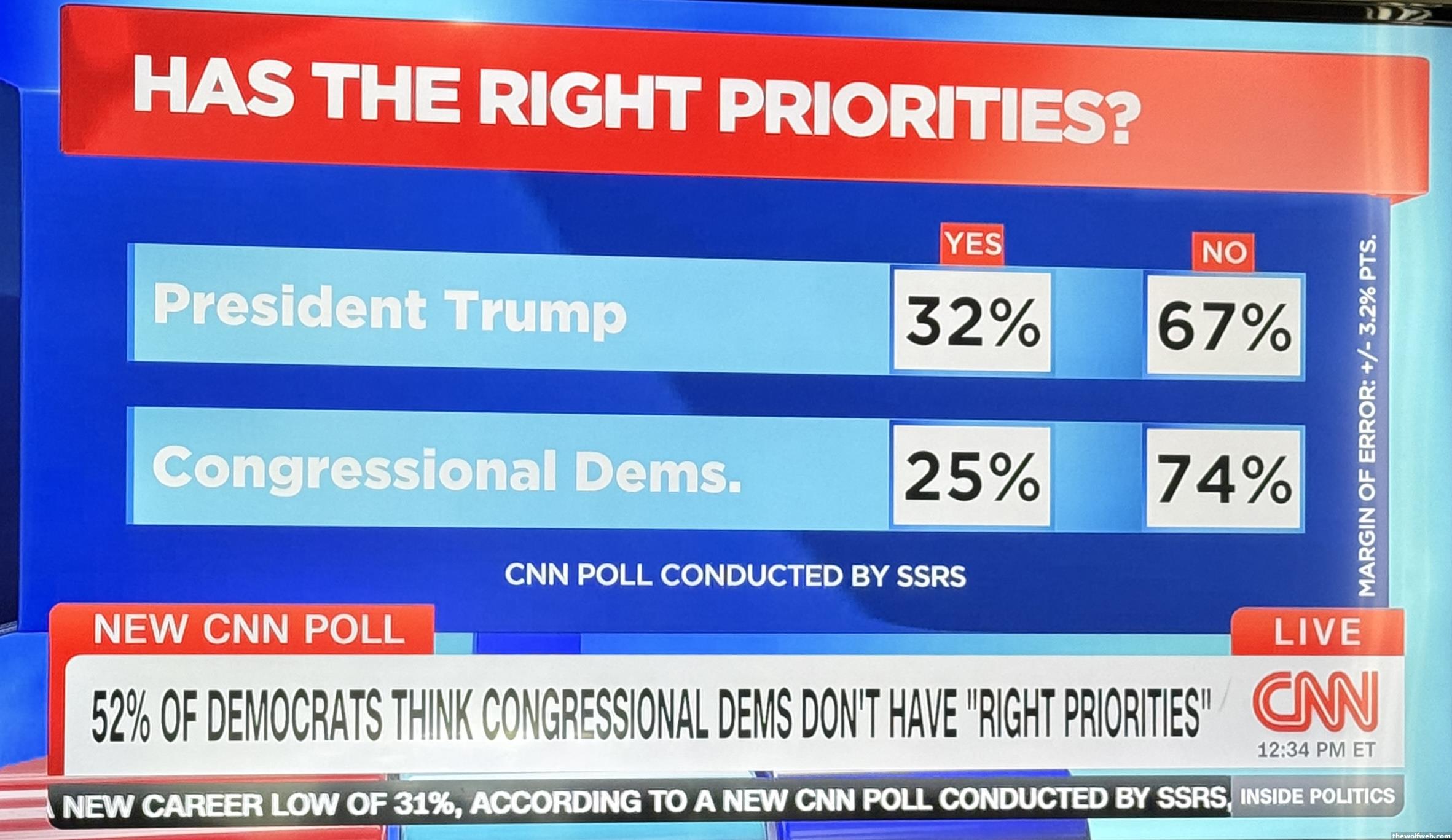 Imo this is a classic symptom of Trump voters always say Trump is right whereas as Dem voters are extremely critical of their "team". Would love to see a question more like "does trump or congressional dems more closely match your priorities"Also a symptom of congressional Dems just failing to rise to the moment, continuing to govern as is this is just a typical opposition party government instead of an actively criminal government