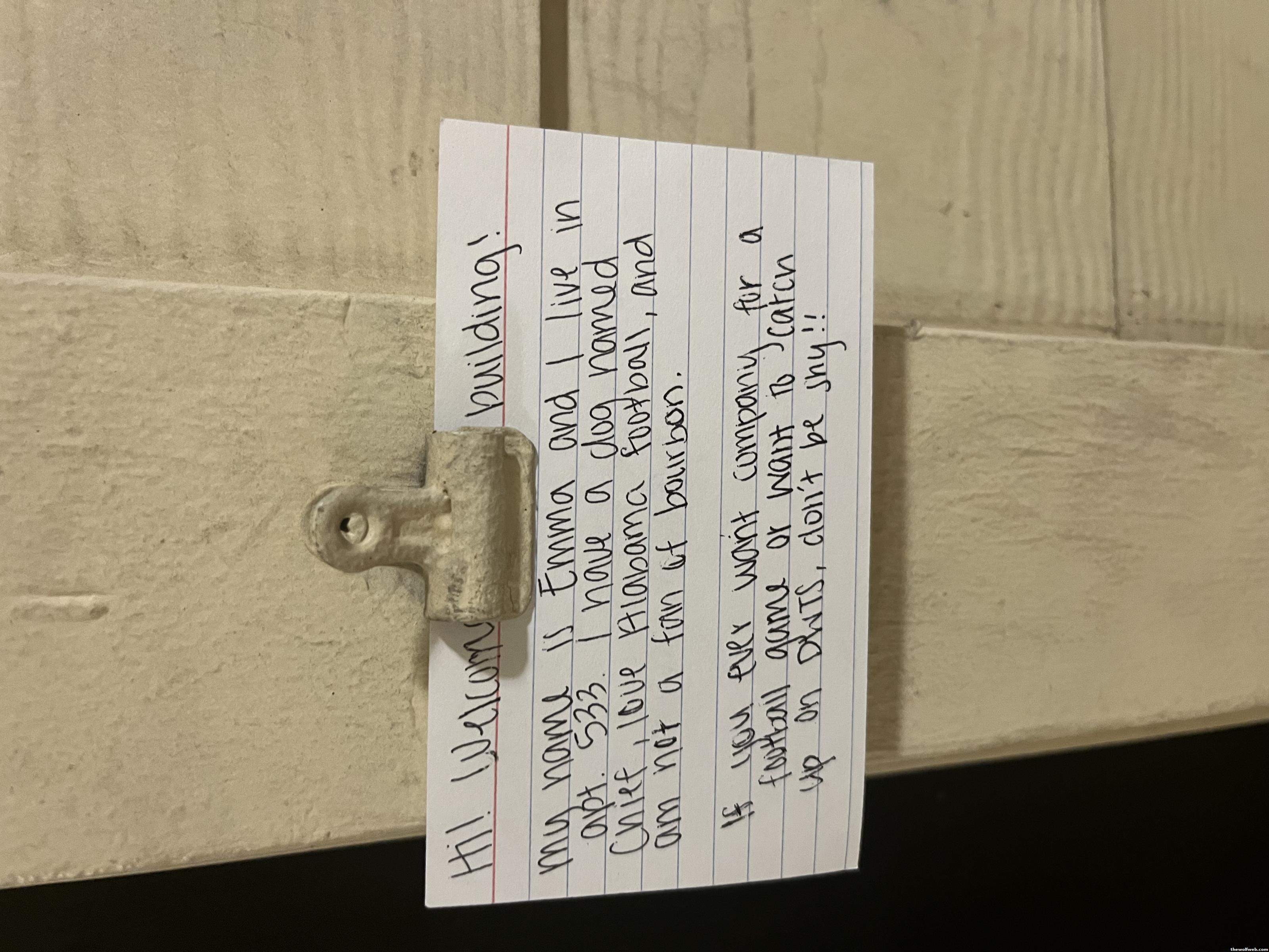 The person in the apt moved in a week or 2 ago. Emma has lived here for like 8 months or so. I feel like if a dude left a note like this on a chicks door, there would be apartment wide email sent about harassment and police investigating etc