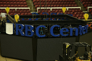It also looked like two sides have "RBC Center" in blue with the blue and yellow RBC Bank logo.
