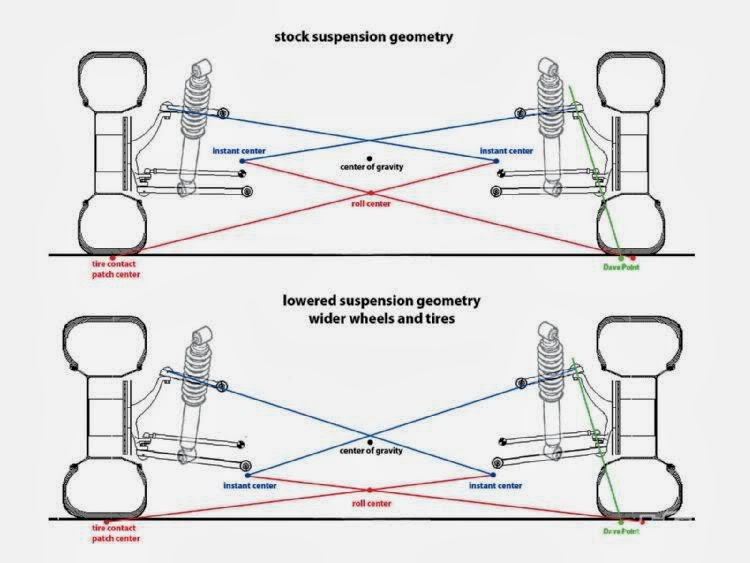 "lowering a Mcpherson strut car drops roll center dramatically. Something being lower on a car may sound good, as "lower is generally better". But in the case of roll center, not really. Roll center is the geometric point in space at which a car rolls around when the suspension compresses. Roll center is almost always lower than the CG of the car. The greater the distance of the roll center from the CG, the longer the roll couple. The roll couple acts as a lever on the car to make it roll. The longer the lever, the more roll. Problem is, CG doesn't drop as fast as roll center does. So when you lower a strut car, you are increasing geometric roll. AKA, you are making the car softer (all things being equal). So what, you ask? A softer front end = more suspension compression, = more positive camber + smaller front contact patch + more tire squirm = more corner entry understeer. So when you lower a car, you actually need stiffer springs just to counter the effect of the increased lever arm acting on the roll couple to begin with. Even with stiffer springs, you may end up with the same resulting roll stiffness as you were when you were stock. The GIF below shows roll center migration as a car is lowered and raised (the red dot is roll center). Included also is a diagram of roll center and CG. Notice the change in distance between the two when a car is lowered. "