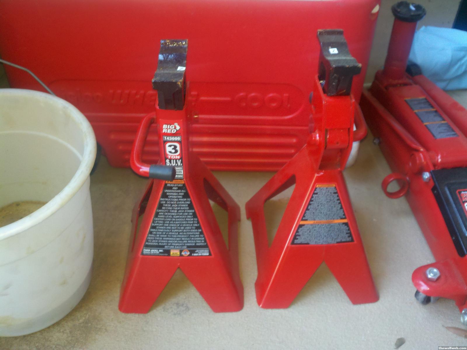 **SPF**2. 2 x 3 ton Big Red jack stands (3 ton total capacity) (pic)**SPF**3. 2 x 1 ton ramps (2 ton total capacity) (pic)4. Halogen work lamp + extra bulb (pic)**SPF**5. Oil change pan + funnel (pic)6.-7. Havoline anti-freeze (<1/2 bottle remaining) Castrol GTX 5W-30 oil (probably 1-2 quarts remaining)(pic)8. Gojo (probably 90-95% remaining) (pic)13. Sylvania auto bulbs: 3147NA/4157NA & 3757A (pic)