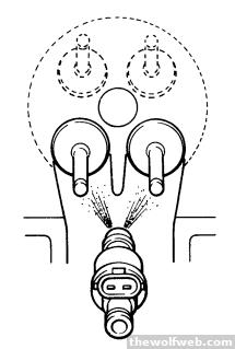 Skipping over throttlebody injection and some of the other less important designs, let's go right to multi-port solenoid injection. For now I will skip discussion of fuel pumps, fuel pressure regulators, etc. Here is a basic fuel injector:A fuel injector is just a magnet and a valve. The magnet lifts the valve off its seat and allows fuel to flow. When a 12 volt circuit is complete, the solenoid coil energizes to pull the valve open. Normally the injector receives switched power from the electrical system, but it only turns on when the ECU pulses the ground signal through a transistor. Fuel pressure is kept constant through a fuel pressure regulator so fuel volume is regulated by the amount of ON time for a given pulse, in milliseconds. So 5 milliseconds delivers more fuel than 2 milliseconds. Some diagrams of port injection in a 4 valve overhead cam engine:There are all sorts of variations in spray patterns and injector design. In the image immediately above, you can see that the injector has two holes in order to direct fuel on to the back of the two intake valves.