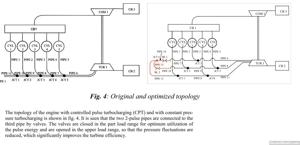 Now here's a real oddball design. This is from a prototype 5 cylinder diesel for marine applications. 5 cylinders have a firing order of 1-2-4-5-3 with 144 degree interval. This creates weird uneven pulsation effects. The particular prototype I am talking about here used a triple-scroll turbo and a complicated valving system. So on the three scrolls it worked like thisscroll 1) single cylinderscroll 2) two cylindersscroll 3) two cylindersAt low rpm/load, they are all divided up among the three scrolls like that. At high rpm, two valves open to connect scroll #2 and #3 with the single cylinder scroll #1. That effectively turns it into an undivided manifold with less pulsation in order to improve turbine efficiency. The whole point of this configuration was to ultimately reduce diesel smoke emissions as part of a marine diesel emissions reduction study.