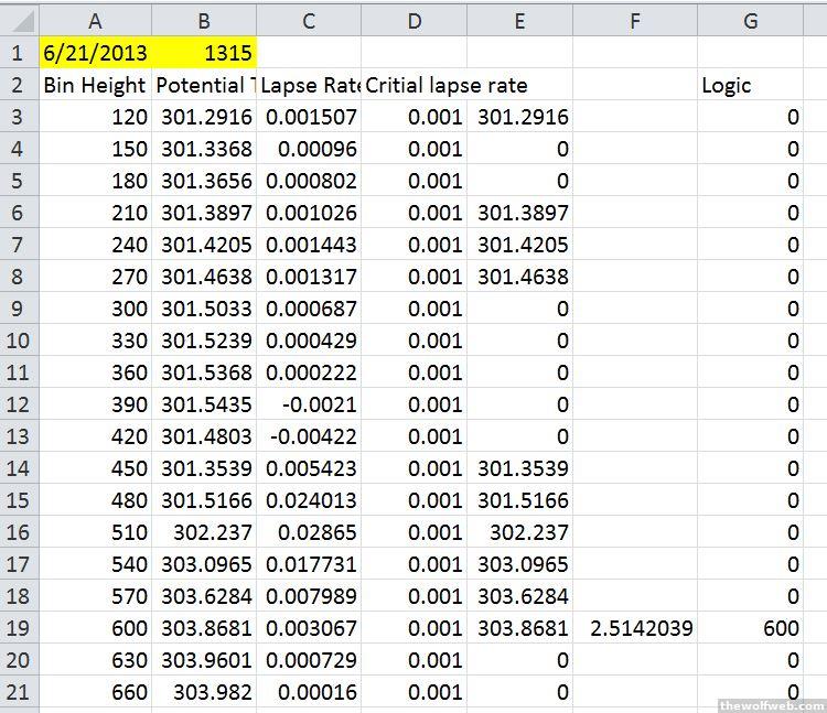Thank you very much! I should be able to jimmy with that and get it integrated into my worksheet. What I am doing is using the calculated potential temperatures from upper air balloon launches to derive the atmospheric boundary layer (ABL). Using something called the Heffter Technique, it is the lowest inversion layer (temp increasing with height) where the potential temperature lapse rate (how it changes with height) is above a certain critical threshold (the column of 0.005, 0.004, etc) and the temps at the top and bottom of the layer are >= 2 Kelvin. If a layer meets that criteria, then the ABL is the height that is 2 Kelvin above the bottom height/temp of the inversion layer.