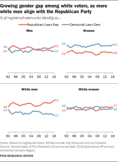 These numbers are nearly a decade old, but I find it interesting that the share of white men who identified as Republican dipped a bit near the beginning of the second George W. Bush administration but then has steadily increased since the beginning of the Barack Obama administration; I'm assuming that this share has continued to increase since 2016.The numbers above are from: https://www.pewresearch.org/politics/2016/09/13/2-party-affiliation-among-voters-1992-2016/I also found these more recent numbers, which seem to suggest a continuation of that trend:These numbers are from: https://www.pewresearch.org/politics/2023/07/12/voting-patterns-in-the-2022-elections/[Edited on August 22, 2023 at 1:01 PM. Reason : ]